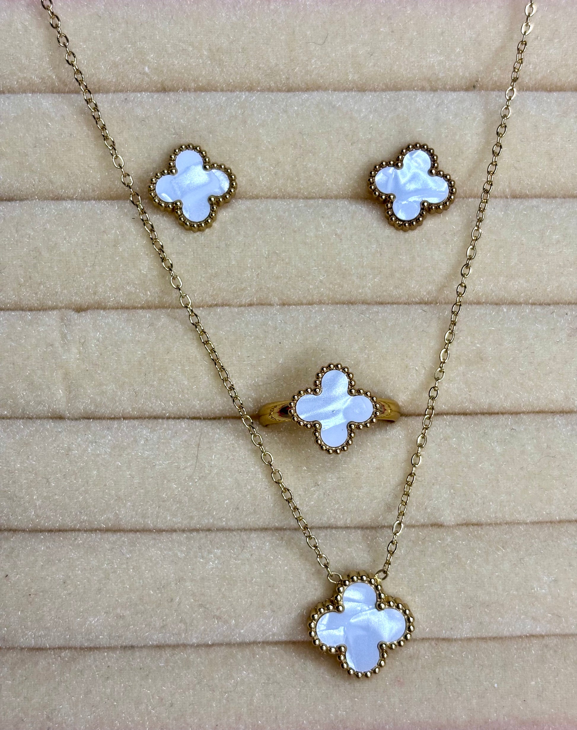 Golden white and black clover combo set Necklace, Earring,Ring (Anti tarnish Stainless steel 18k gold plated)